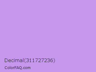 Decimal 311727236 Color is a light purple color and the nearest color is Bright Lavender #bf94e4. Hex code #c597ec and RGB value is rgb(197,151,236). In RGB color space, this color is composed of 77% red, 59% green, 93% blue, In CMYK color space, this color is composed of 17% cyan, 36% magenta, 0% yellow , 7% black , In HSL color space, this color has a hue angle of 272° , 69% saturation and 76% lightness.