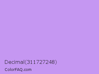 Decimal 311727248 Color is a light violet color and the nearest color is Pale Violet #cc99ff. Hex code #c597f2 and RGB value is rgb(197,151,242). In RGB color space, this color is composed of 77% red, 59% green, 95% blue, In CMYK color space, this color is composed of 19% cyan, 38% magenta, 0% yellow , 5% black , In HSL color space, this color has a hue angle of 270° , 78% saturation and 77% lightness.