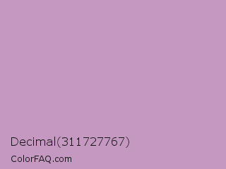 Decimal 311727767 Color is a light magenta color and the nearest color is Pastel Violet #cb99c9. Hex code #c598c1 and RGB value is rgb(197,152,193). In RGB color space, this color is composed of 77% red, 60% green, 76% blue, In CMYK color space, this color is composed of 0% cyan, 23% magenta, 2% yellow , 23% black , In HSL color space, this color has a hue angle of 305° , 28% saturation and 68% lightness.