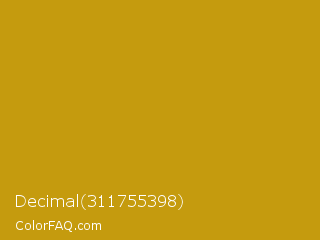 Decimal 311755398 Color is a normal yellow color and the nearest color is Pizza #c99415. Hex code #c59b0e and RGB value is rgb(197,155,14). In RGB color space, this color is composed of 77% red, 61% green, 5% blue, In CMYK color space, this color is composed of 0% cyan, 21% magenta, 93% yellow , 23% black , In HSL color space, this color has a hue angle of 46° , 87% saturation and 41% lightness.