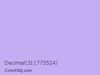 Decimal 311775524 Color is a very light indigo color and the nearest color is Perfume #d0bef8. Hex code #c5adf4 and RGB value is rgb(197,173,244). In RGB color space, this color is composed of 77% red, 68% green, 96% blue, In CMYK color space, this color is composed of 19% cyan, 29% magenta, 0% yellow , 4% black , In HSL color space, this color has a hue angle of 260° , 76% saturation and 82% lightness.
