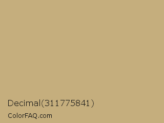 Decimal 311775841 Color is a light orange color and the nearest color is Light French Beige #c8ad7f. Hex code #c5ae7d and RGB value is rgb(197,174,125). In RGB color space, this color is composed of 77% red, 68% green, 49% blue, In CMYK color space, this color is composed of 0% cyan, 12% magenta, 37% yellow , 23% black , In HSL color space, this color has a hue angle of 41° , 38% saturation and 63% lightness.