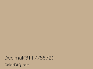 Decimal 311775872 Color is a light orange color and the nearest color is Indian Khaki #c3b091. Hex code #c5ae90 and RGB value is rgb(197,174,144). In RGB color space, this color is composed of 77% red, 68% green, 56% blue, In CMYK color space, this color is composed of 0% cyan, 12% magenta, 27% yellow , 23% black , In HSL color space, this color has a hue angle of 34° , 31% saturation and 67% lightness.