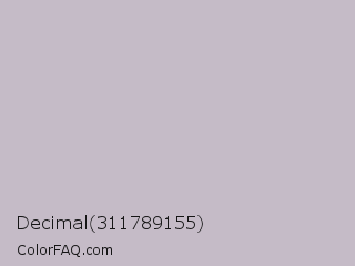 Decimal 311789155 Color is a light purple color and the nearest color is Pale Slate #c3bfc1. Hex code #c5bbc7 and RGB value is rgb(197,187,199). In RGB color space, this color is composed of 77% red, 73% green, 78% blue, In CMYK color space, this color is composed of 1% cyan, 6% magenta, 0% yellow , 22% black , In HSL color space, this color has a hue angle of 290° , 10% saturation and 76% lightness.