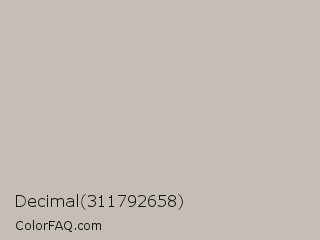 Decimal 311792658 Color is a light orange color and the nearest color is Cotton Seed #c2bdb6. Hex code #c5beb4 and RGB value is rgb(197,190,180). In RGB color space, this color is composed of 77% red, 75% green, 71% blue, In CMYK color space, this color is composed of 0% cyan, 4% magenta, 9% yellow , 23% black , In HSL color space, this color has a hue angle of 35° , 13% saturation and 74% lightness.