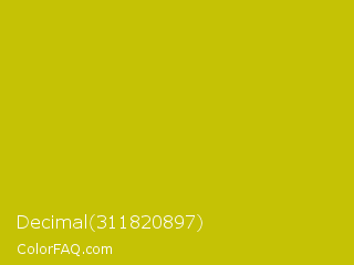 Decimal 311820897 Color is a normal yellow color and the nearest color is Rio Grande #bbd009. Hex code #c5c205 and RGB value is rgb(197,194,5). In RGB color space, this color is composed of 77% red, 76% green, 2% blue, In CMYK color space, this color is composed of 0% cyan, 2% magenta, 97% yellow , 23% black , In HSL color space, this color has a hue angle of 59° , 95% saturation and 40% lightness.