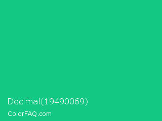 Decimal 19490069 Color is a normal green color and the nearest color is Mountain Meadow Crayola #1ab385. Hex code #13c883 and RGB value is rgb(19,200,131). In RGB color space, this color is composed of 7% red, 78% green, 51% blue, In CMYK color space, this color is composed of 91% cyan, 0% magenta, 35% yellow , 22% black , In HSL color space, this color has a hue angle of 157° , 83% saturation and 43% lightness.