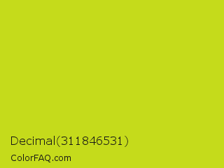 Decimal 311846531 Color is a normal yellow color and the nearest color is Las Palmas #c6e610. Hex code #c5db1b and RGB value is rgb(197,219,27). In RGB color space, this color is composed of 77% red, 86% green, 11% blue, In CMYK color space, this color is composed of 10% cyan, 0% magenta, 88% yellow , 14% black , In HSL color space, this color has a hue angle of 67° , 78% saturation and 48% lightness.