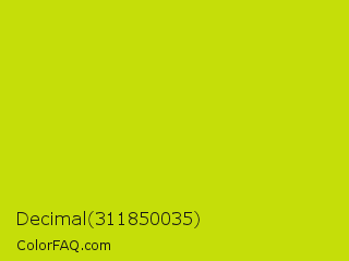 Decimal 311850035 Color is a normal yellow color and the nearest color is Bitter Lemon #cae00d. Hex code #c5de09 and RGB value is rgb(197,222,9). In RGB color space, this color is composed of 77% red, 87% green, 4% blue, In CMYK color space, this color is composed of 11% cyan, 0% magenta, 96% yellow , 13% black , In HSL color space, this color has a hue angle of 67° , 92% saturation and 45% lightness.