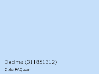 Decimal 311851312 Color is a very light blue color and the nearest color is Tropical Blue #c3ddf9. Hex code #c5dffa and RGB value is rgb(197,223,250). In RGB color space, this color is composed of 77% red, 87% green, 98% blue, In CMYK color space, this color is composed of 21% cyan, 11% magenta, 0% yellow , 2% black , In HSL color space, this color has a hue angle of 211° , 84% saturation and 88% lightness.