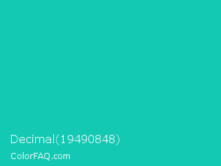 Decimal 19490848 Color is a normal cyan color and the nearest color is Tiffany Blue #0abab5. Hex code #13c9b4 and RGB value is rgb(19,201,180). In RGB color space, this color is composed of 7% red, 79% green, 71% blue, In CMYK color space, this color is composed of 91% cyan, 0% magenta, 10% yellow , 21% black , In HSL color space, this color has a hue angle of 173° , 83% saturation and 43% lightness.