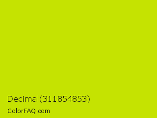 Decimal 311854853 Color is a normal yellow color and the nearest color is Bitter Lemon #cae00d. Hex code #c5e301 and RGB value is rgb(197,227,1). In RGB color space, this color is composed of 77% red, 89% green, 0% blue, In CMYK color space, this color is composed of 13% cyan, 0% magenta, 100% yellow , 11% black , In HSL color space, this color has a hue angle of 68° , 99% saturation and 45% lightness.