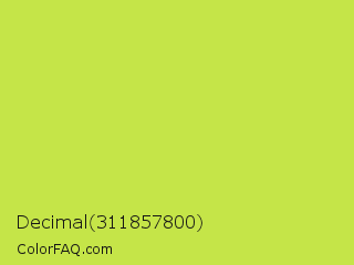 Decimal 311857800 Color is a normal lime color and the nearest color is June Bud #bdda57. Hex code #c5e548 and RGB value is rgb(197,229,72). In RGB color space, this color is composed of 77% red, 90% green, 28% blue, In CMYK color space, this color is composed of 14% cyan, 0% magenta, 69% yellow , 10% black , In HSL color space, this color has a hue angle of 72° , 75% saturation and 59% lightness.