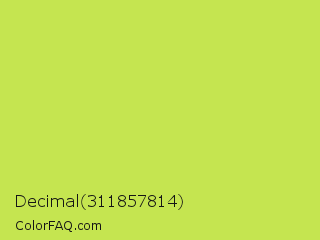 Decimal 311857814 Color is a light lime color and the nearest color is June Bud #bdda57. Hex code #c5e550 and RGB value is rgb(197,229,80). In RGB color space, this color is composed of 77% red, 90% green, 31% blue, In CMYK color space, this color is composed of 14% cyan, 0% magenta, 65% yellow , 10% black , In HSL color space, this color has a hue angle of 73° , 74% saturation and 61% lightness.