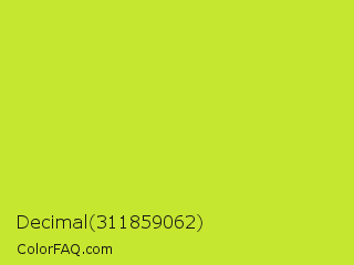 Decimal 311859062 Color is a normal lime color and the nearest color is Pear #d1e231. Hex code #c5e730 and RGB value is rgb(197,231,48). In RGB color space, this color is composed of 77% red, 91% green, 19% blue, In CMYK color space, this color is composed of 15% cyan, 0% magenta, 79% yellow , 9% black , In HSL color space, this color has a hue angle of 71° , 79% saturation and 55% lightness.