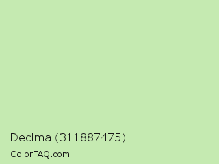 Decimal 311887475 Color is a very light green color and the nearest color is Gossip #d2f8b0. Hex code #c5eab1 and RGB value is rgb(197,234,177). In RGB color space, this color is composed of 77% red, 92% green, 69% blue, In CMYK color space, this color is composed of 16% cyan, 0% magenta, 24% yellow , 8% black , In HSL color space, this color has a hue angle of 99° , 58% saturation and 81% lightness.
