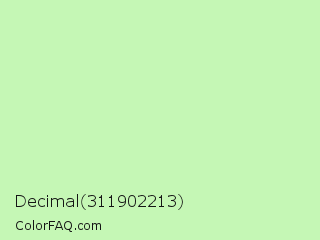 Decimal 311902213 Color is a very light green color and the nearest color is Gossip #d2f8b0. Hex code #c5f7b5 and RGB value is rgb(197,247,181). In RGB color space, this color is composed of 77% red, 97% green, 71% blue, In CMYK color space, this color is composed of 20% cyan, 0% magenta, 27% yellow , 3% black , In HSL color space, this color has a hue angle of 105° , 80% saturation and 84% lightness.