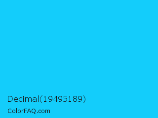 Decimal 19495189 Color is a normal cyan color and the nearest color is Spiro Disco Ball #0fc0fc. Hex code #13cdfb and RGB value is rgb(19,205,251). In RGB color space, this color is composed of 7% red, 80% green, 98% blue, In CMYK color space, this color is composed of 92% cyan, 18% magenta, 0% yellow , 2% black , In HSL color space, this color has a hue angle of 192° , 97% saturation and 53% lightness.