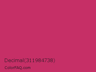 Decimal 311984738 Color is a normal rose color and the nearest color is Hibiscus #b6316c. Hex code #c62f66 and RGB value is rgb(198,47,102). In RGB color space, this color is composed of 78% red, 18% green, 40% blue, In CMYK color space, this color is composed of 0% cyan, 76% magenta, 48% yellow , 22% black , In HSL color space, this color has a hue angle of 338° , 62% saturation and 48% lightness.
