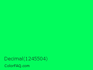 Decimal 1245504 Color is a normal green color and the nearest color is Spring Green #00ff7f. Hex code #01fc5c and RGB value is rgb(1,252,92). In RGB color space, this color is composed of 0% red, 99% green, 36% blue, In CMYK color space, this color is composed of 100% cyan, 0% magenta, 63% yellow , 1% black , In HSL color space, this color has a hue angle of 142° , 99% saturation and 50% lightness.