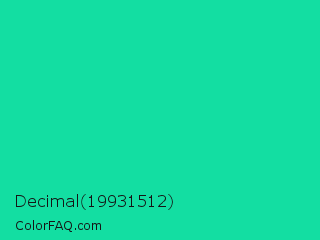 Decimal 19931512 Color is a normal green color and the nearest color is Caribbean Green #00cc99. Hex code #13dea2 and RGB value is rgb(19,222,162). In RGB color space, this color is composed of 7% red, 87% green, 64% blue, In CMYK color space, this color is composed of 91% cyan, 0% magenta, 27% yellow , 13% black , In HSL color space, this color has a hue angle of 162° , 84% saturation and 47% lightness.