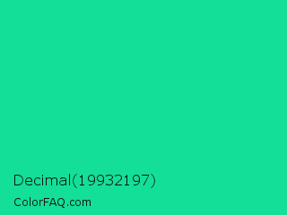 Decimal 19932197 Color is a normal green color and the nearest color is Caribbean Green #00cc99. Hex code #13df99 and RGB value is rgb(19,223,153). In RGB color space, this color is composed of 7% red, 87% green, 60% blue, In CMYK color space, this color is composed of 91% cyan, 0% magenta, 31% yellow , 13% black , In HSL color space, this color has a hue angle of 159° , 84% saturation and 47% lightness.