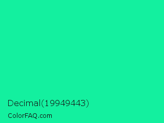 Decimal 19949443 Color is a normal green color and the nearest color is Medium Spring Green #00fa9a. Hex code #13f09f and RGB value is rgb(19,240,159). In RGB color space, this color is composed of 7% red, 94% green, 62% blue, In CMYK color space, this color is composed of 92% cyan, 0% magenta, 34% yellow , 6% black , In HSL color space, this color has a hue angle of 158° , 88% saturation and 51% lightness.