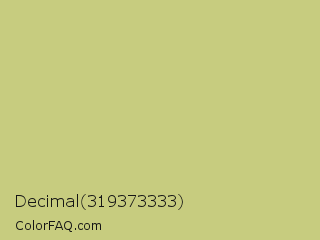 Decimal 319373333 Color is a light yellow color and the nearest color is Pine Glade #c7cd90. Hex code #c7cc7f and RGB value is rgb(199,204,127). In RGB color space, this color is composed of 78% red, 80% green, 50% blue, In CMYK color space, this color is composed of 2% cyan, 0% magenta, 38% yellow , 20% black , In HSL color space, this color has a hue angle of 64° , 43% saturation and 65% lightness.