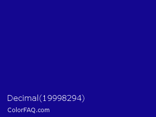 Decimal 19998294 Color is a dark indigo color and the nearest color is Ultramarine #120a8f. Hex code #140790 and RGB value is rgb(20,7,144). In RGB color space, this color is composed of 8% red, 3% green, 56% blue, In CMYK color space, this color is composed of 86% cyan, 95% magenta, 0% yellow , 44% black , In HSL color space, this color has a hue angle of 246° , 91% saturation and 30% lightness.