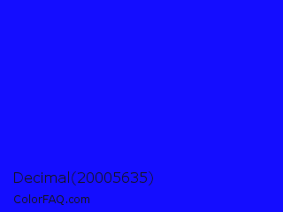 Decimal 20005635 Color is a normal indigo color and the nearest color is Bluebonnet #1c1cf0. Hex code #140dff and RGB value is rgb(20,13,255). In RGB color space, this color is composed of 8% red, 5% green, 100% blue, In CMYK color space, this color is composed of 92% cyan, 95% magenta, 0% yellow , 0% black , In HSL color space, this color has a hue angle of 242° , 100% saturation and 53% lightness.