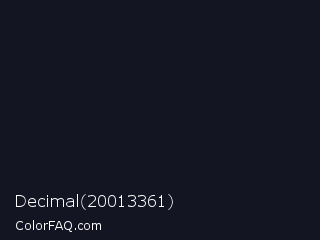 Decimal 20013361 Color is a very dark blue color and the nearest color is Mirage #161928. Hex code #141523 and RGB value is rgb(20,21,35). In RGB color space, this color is composed of 8% red, 8% green, 14% blue, In CMYK color space, this color is composed of 43% cyan, 40% magenta, 0% yellow , 86% black , In HSL color space, this color has a hue angle of 236° , 27% saturation and 11% lightness.