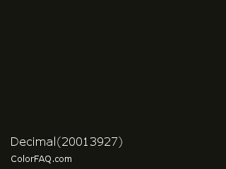 Decimal 20013927 Color is a almost black lime color and the nearest color is Hunter Green #161d10. Hex code #14160f and RGB value is rgb(20,22,15). In RGB color space, this color is composed of 8% red, 9% green, 6% blue, In CMYK color space, this color is composed of 9% cyan, 0% magenta, 32% yellow , 91% black , In HSL color space, this color has a hue angle of 77° , 19% saturation and 7% lightness.