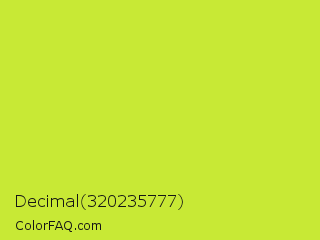 Decimal 320235777 Color is a normal lime color and the nearest color is Pear #d1e231. Hex code #c8e935 and RGB value is rgb(200,233,53). In RGB color space, this color is composed of 78% red, 91% green, 21% blue, In CMYK color space, this color is composed of 14% cyan, 0% magenta, 77% yellow , 9% black , In HSL color space, this color has a hue angle of 71° , 80% saturation and 56% lightness.