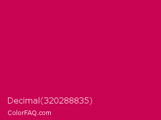 Decimal 320288835 Color is a normal rose color and the nearest color is Rubine Red #d10056. Hex code #c90453 and RGB value is rgb(201,4,83). In RGB color space, this color is composed of 79% red, 2% green, 33% blue, In CMYK color space, this color is composed of 0% cyan, 98% magenta, 59% yellow , 21% black , In HSL color space, this color has a hue angle of 336° , 96% saturation and 40% lightness.