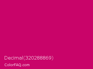 Decimal 320288869 Color is a normal rose color and the nearest color is Rubine Red #d10056. Hex code #c90469 and RGB value is rgb(201,4,105). In RGB color space, this color is composed of 79% red, 2% green, 41% blue, In CMYK color space, this color is composed of 0% cyan, 98% magenta, 48% yellow , 21% black , In HSL color space, this color has a hue angle of 329° , 96% saturation and 40% lightness.