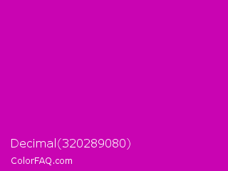 Decimal 320289080 Color is a normal magenta color and the nearest color is Deep Magenta #cc00cc. Hex code #c904b2 and RGB value is rgb(201,4,178). In RGB color space, this color is composed of 79% red, 2% green, 70% blue, In CMYK color space, this color is composed of 0% cyan, 98% magenta, 11% yellow , 21% black , In HSL color space, this color has a hue angle of 307° , 96% saturation and 40% lightness.