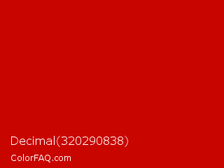 Decimal 320290838 Color is a normal red color and the nearest color is Boston University Red #cc0000. Hex code #c90500 and RGB value is rgb(201,5,0). In RGB color space, this color is composed of 79% red, 2% green, 0% blue, In CMYK color space, this color is composed of 0% cyan, 98% magenta, 100% yellow , 21% black , In HSL color space, this color has a hue angle of 1° , 100% saturation and 39% lightness.