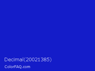 Decimal 20021385 Color is a normal blue color and the nearest color is Persian Blue #1c39bb. Hex code #141cc9 and RGB value is rgb(20,28,201). In RGB color space, this color is composed of 8% red, 11% green, 79% blue, In CMYK color space, this color is composed of 90% cyan, 86% magenta, 0% yellow , 21% black , In HSL color space, this color has a hue angle of 237° , 82% saturation and 43% lightness.