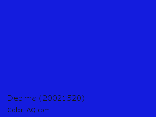 Decimal 20021520 Color is a normal blue color and the nearest color is Bluebonnet #1c1cf0. Hex code #141cde and RGB value is rgb(20,28,222). In RGB color space, this color is composed of 8% red, 11% green, 87% blue, In CMYK color space, this color is composed of 91% cyan, 87% magenta, 0% yellow , 13% black , In HSL color space, this color has a hue angle of 238° , 83% saturation and 47% lightness.