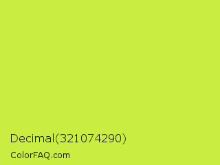Decimal 321074290 Color is a normal lime color and the nearest color is Pear #d1e231. Hex code #c9ed40 and RGB value is rgb(201,237,64). In RGB color space, this color is composed of 79% red, 93% green, 25% blue, In CMYK color space, this color is composed of 15% cyan, 0% magenta, 73% yellow , 7% black , In HSL color space, this color has a hue angle of 72° , 83% saturation and 59% lightness.