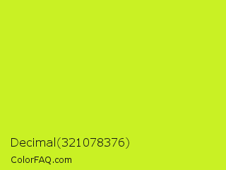 Decimal 321078376 Color is a normal lime color and the nearest color is Pear #d1e231. Hex code #c9f124 and RGB value is rgb(201,241,36). In RGB color space, this color is composed of 79% red, 95% green, 14% blue, In CMYK color space, this color is composed of 17% cyan, 0% magenta, 85% yellow , 5% black , In HSL color space, this color has a hue angle of 72° , 88% saturation and 54% lightness.