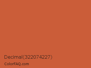 Decimal 322074227 Color is a normal color and the nearest color is Dark Coral #cd5b45. Hex code #cb5d39 and RGB value is rgb(203,93,57). In RGB color space, this color is composed of 80% red, 36% green, 22% blue, In CMYK color space, this color is composed of 0% cyan, 54% magenta, 72% yellow , 20% black , In HSL color space, this color has a hue angle of 15° , 58% saturation and 51% lightness.
