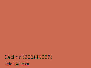 Decimal 322111337 Color is a normal red color and the nearest color is Copper Red #cb6d51. Hex code #cb6951 and RGB value is rgb(203,105,81). In RGB color space, this color is composed of 80% red, 41% green, 32% blue, In CMYK color space, this color is composed of 0% cyan, 48% magenta, 60% yellow , 20% black , In HSL color space, this color has a hue angle of 12° , 54% saturation and 56% lightness.