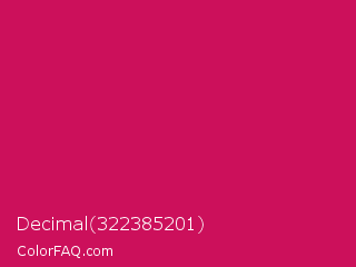 Decimal 322385201 Color is a normal rose color and the nearest color is Debian Red #d70a53. Hex code #cc105b and RGB value is rgb(204,16,91). In RGB color space, this color is composed of 80% red, 6% green, 36% blue, In CMYK color space, this color is composed of 0% cyan, 92% magenta, 55% yellow , 20% black , In HSL color space, this color has a hue angle of 336° , 85% saturation and 43% lightness.