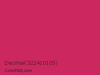 Decimal 322410105 Color is a normal rose color and the nearest color is Rose Red #c21e56. Hex code #cc285f and RGB value is rgb(204,40,95). In RGB color space, this color is composed of 80% red, 16% green, 37% blue, In CMYK color space, this color is composed of 0% cyan, 80% magenta, 53% yellow , 20% black , In HSL color space, this color has a hue angle of 340° , 67% saturation and 48% lightness.