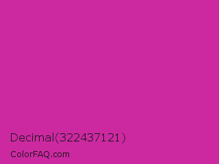 Decimal 322437121 Color is a normal magenta color and the nearest color is Royal Fuchsia #ca2c92. Hex code #cc29a1 and RGB value is rgb(204,41,161). In RGB color space, this color is composed of 80% red, 16% green, 63% blue, In CMYK color space, this color is composed of 0% cyan, 80% magenta, 21% yellow , 20% black , In HSL color space, this color has a hue angle of 316° , 67% saturation and 48% lightness.