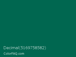 Decimal 5169758582 Color is a very dark cyan color and the nearest color is Bottle Green #006a4e. Hex code #006750 and RGB value is rgb(0,103,80). In RGB color space, this color is composed of 0% red, 40% green, 31% blue, In CMYK color space, this color is composed of 100% cyan, 0% magenta, 22% yellow , 60% black , In HSL color space, this color has a hue angle of 167° , 100% saturation and 20% lightness.