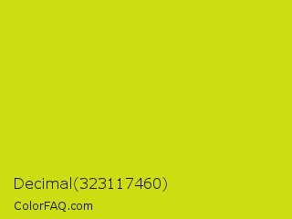Decimal 323117460 Color is a normal yellow color and the nearest color is Bitter Lemon #cae00d. Hex code #ccde12 and RGB value is rgb(204,222,18). In RGB color space, this color is composed of 80% red, 87% green, 7% blue, In CMYK color space, this color is composed of 8% cyan, 0% magenta, 92% yellow , 13% black , In HSL color space, this color has a hue angle of 65° , 85% saturation and 47% lightness.