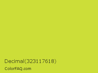Decimal 323117618 Color is a normal yellow color and the nearest color is Pear #d1e231. Hex code #ccde38 and RGB value is rgb(204,222,56). In RGB color space, this color is composed of 80% red, 87% green, 22% blue, In CMYK color space, this color is composed of 8% cyan, 0% magenta, 75% yellow , 13% black , In HSL color space, this color has a hue angle of 67° , 72% saturation and 55% lightness.