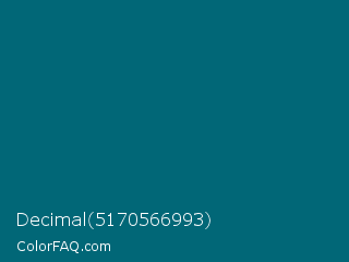 Decimal 5170566993 Color is a dark cyan color and the nearest color is Mosque #036a6e. Hex code #016777 and RGB value is rgb(1,103,119). In RGB color space, this color is composed of 0% red, 40% green, 47% blue, In CMYK color space, this color is composed of 99% cyan, 13% magenta, 0% yellow , 53% black , In HSL color space, this color has a hue angle of 188° , 98% saturation and 24% lightness.
